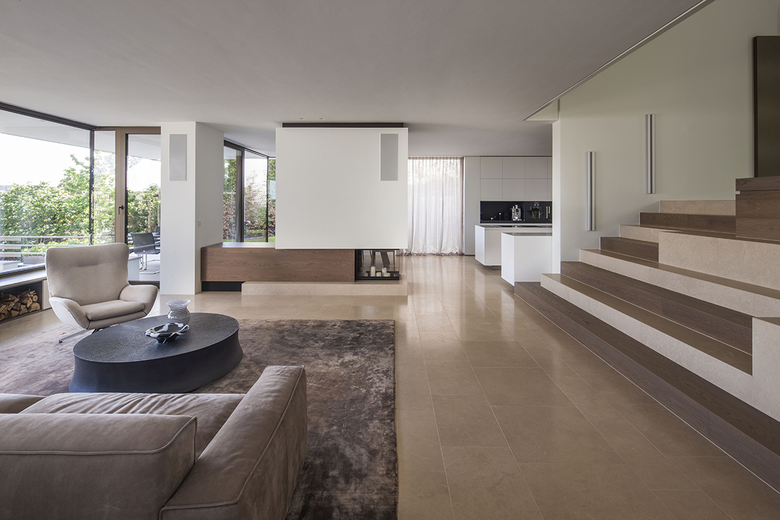 Der Zutritt erfolgt über eine großzügige zweigeschossige Eingangshalle im Erdgeschoss. Eine Treppenlandschaft - Split-Level verbindet das Wohngeschoss mit Essbereich und offener Küche mit den privaten Bereichen im Obergeschoss (Schlafen, Masterbad, Ankleide, Arbeiten). Der offene fließende Raum des Wohngeschosses wird durch einen zentralen Kamin definiert, der subtil den Ess- und Kochbereich vom Wohnbereich trennt.