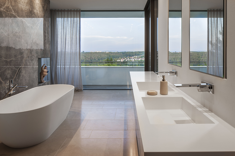 Die Fassade in weißem Glattputz wird je nach Lage und Ausrichtung großflächig von raumhohen Fensterelementen durchbrochen.