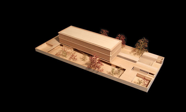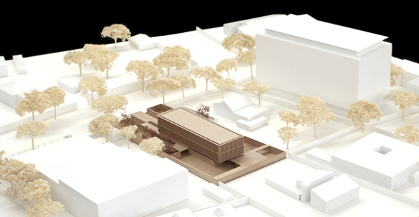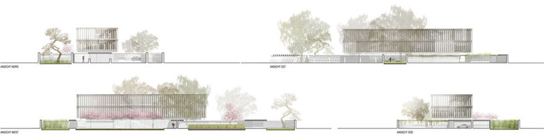 Außenanlagen – Durch die Verschränkung des Baukörpers mit den schwebenden Überdachungen und der umlaufenden Mauer ergeben sich unterschiedliche Freiraumsituationen, die - in Anlehnung an die Nutzungen im Innenraum - mit verschiedenen entwurflichen Themen besetzt werden. Der Bereich westlich der Architektur wird weitgehend befestigt ausgebildet und ist für Stellplätze und PKW-Verkehr vorgesehen. Ein geschliffener Ortbeton als Bodenbelag greift die Farbigkeit und Materialität der Mauern auf und wird durch bodenbündige Metallbänder gegliedert. Der südliche Hof wird mit einem berankten Gerüst überstellt, welches eine schattenspendende „grüne Decke“ bildet. Östlich des Gebäudekörpers schließen fünf repräsentative Freiraumfenster an. Neben dem Eingangsbereich an der Schleuse bilden kleinkronige Kiefern und Natursteinfindlinge den Auftakt. Darauf folgen im Visagarten geschnittene immergrüne Heckenelemente und Magnolienbäume. Der Überdachung nahe dem Treppenhaus wird eine hölzerne Gartenterrasse zugeordnet. Als Fortsetzung des Foyers in den Außenraum dient ein Hain aus Zierkirschen, unter dem ein Patchworkteppich aus Naturstein, Moos und Bodendeckern ausgebreitet wird. Den Abschluss im Süden finden die Gartenräume in einem kleinen Hof, welcher eine vielfältige Gräserpflanzungen vorweist.