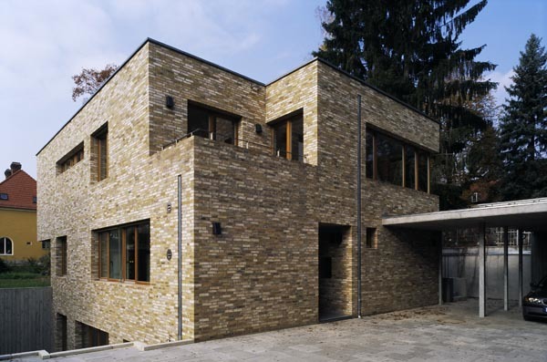 Die kubische Architektur schafft einen plastischen Baukörper in den Eingänge und Terrassen eingearbeitet sind. Das Haus ist komplett mit Ziegel verkleidet und steht in der Tradition der frühen Moderne. Der unregelmäßige Ziegel bietet einen klaren Kontrast zur geradlinigen Architektur. Zum Ober- und Untergeschoß ist der Treppenlauf aus Eichenholz über eine leicht gewandelte Stahlbetontreppe mit geschlossenen Holztritten ausgeführt. Im Treppenauge steht über alle Etagen eine Betonscheibe, die mit Eichensperrholzplatten verkleidet ist. Die vertikale Schichtung über 3 Ebenen gliedert sich von oben nach unten in Schlafen Kinder/Eltern – Wohnen/ Essen – Arbeiten/Besuch. Über ein Atrium wird das Untergeschoss großzügig über raumhohe Fenster belichtet. Die Einliegerwohnung wird über den zweiten Lichthof erschlossen. Die Kinderzimmer sind nach Osten und Westen ausgerichtet.