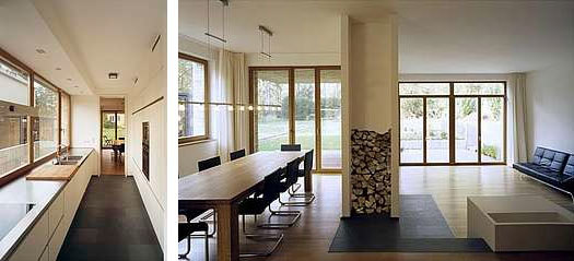 Die verwendeten Materialien der Innenräume beschränken sich bewusst auf weiße Putzflächen, Schiefer für die Fußböden der stärker beanspruchten Bereiche und Eichenholz als Parkett und für die Ausbauten. Als farbliche Auffrischung sind Türblätter und die Einbauschränke im Erdgeschoss und in der Kinderetage in rubinrot gehalten.