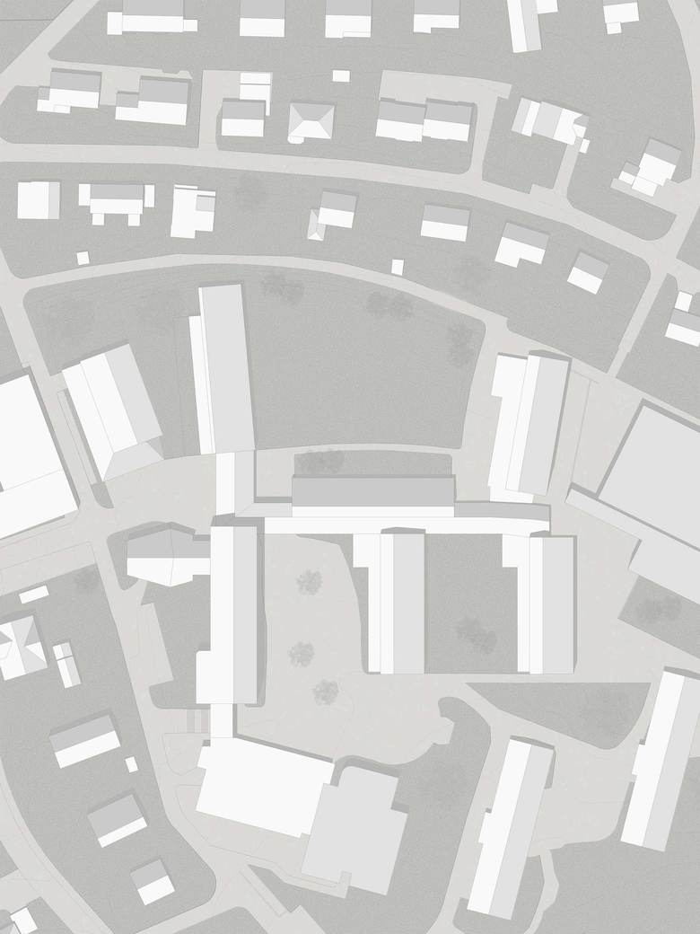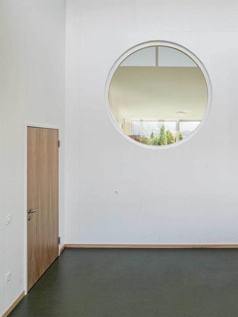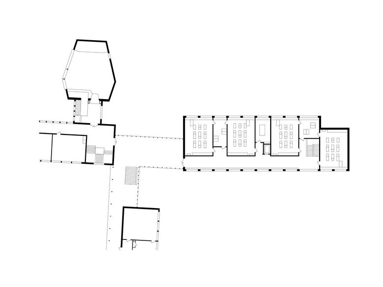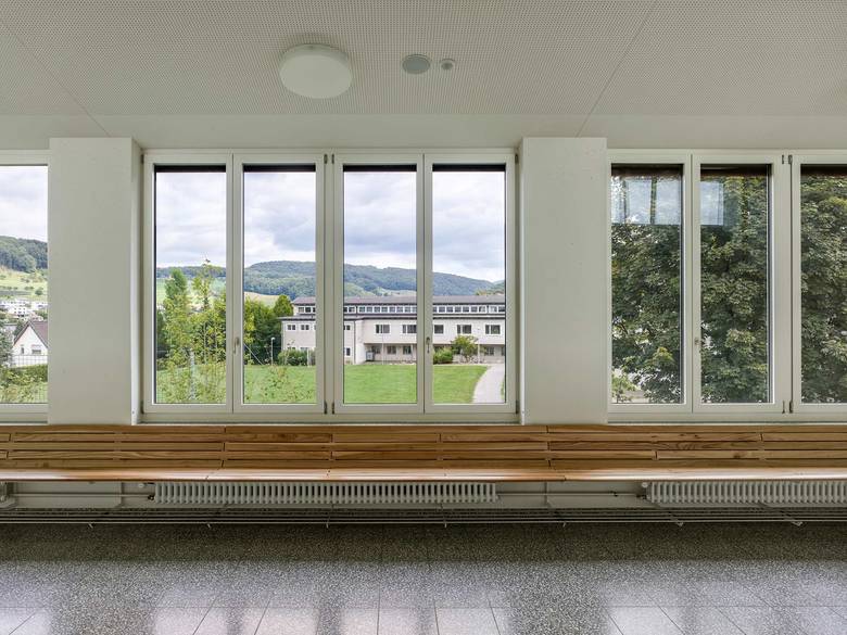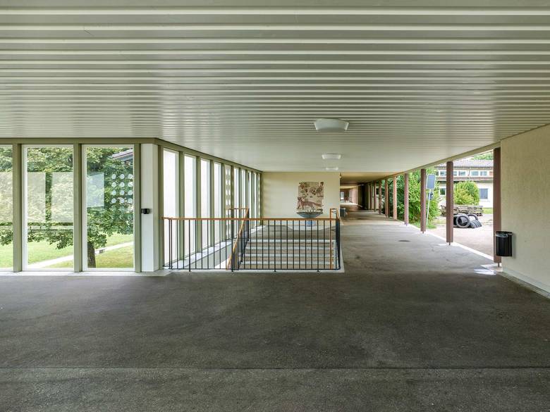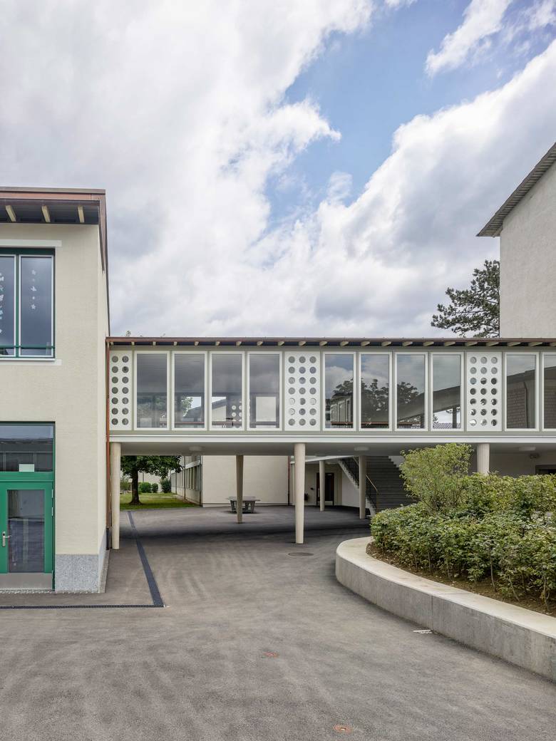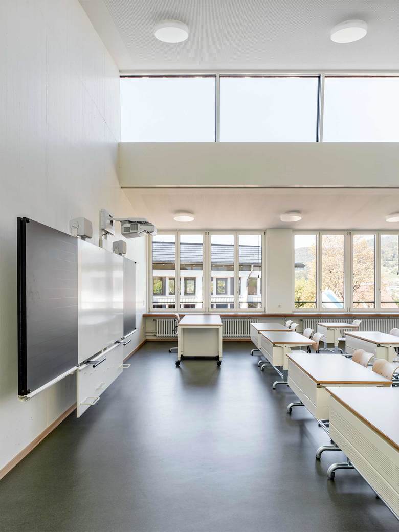 Die Grundrisstypologie des zweigeschossigen Gebäudes entwickelt sich aus dem Bestand heraus. Pro Stockwerk sind jeweils vier Schulzimmer entlang eines breiten Korridors angeordnet. Zwischen den Schulzimmern eingefügte Gruppenräume brechen den Korridor auf und eröffnen spannende Querbezüge. Mittels des überhohen Erdgeschosses und der gefalteten Dachfigur werden so alle Räume optimal belichtet.