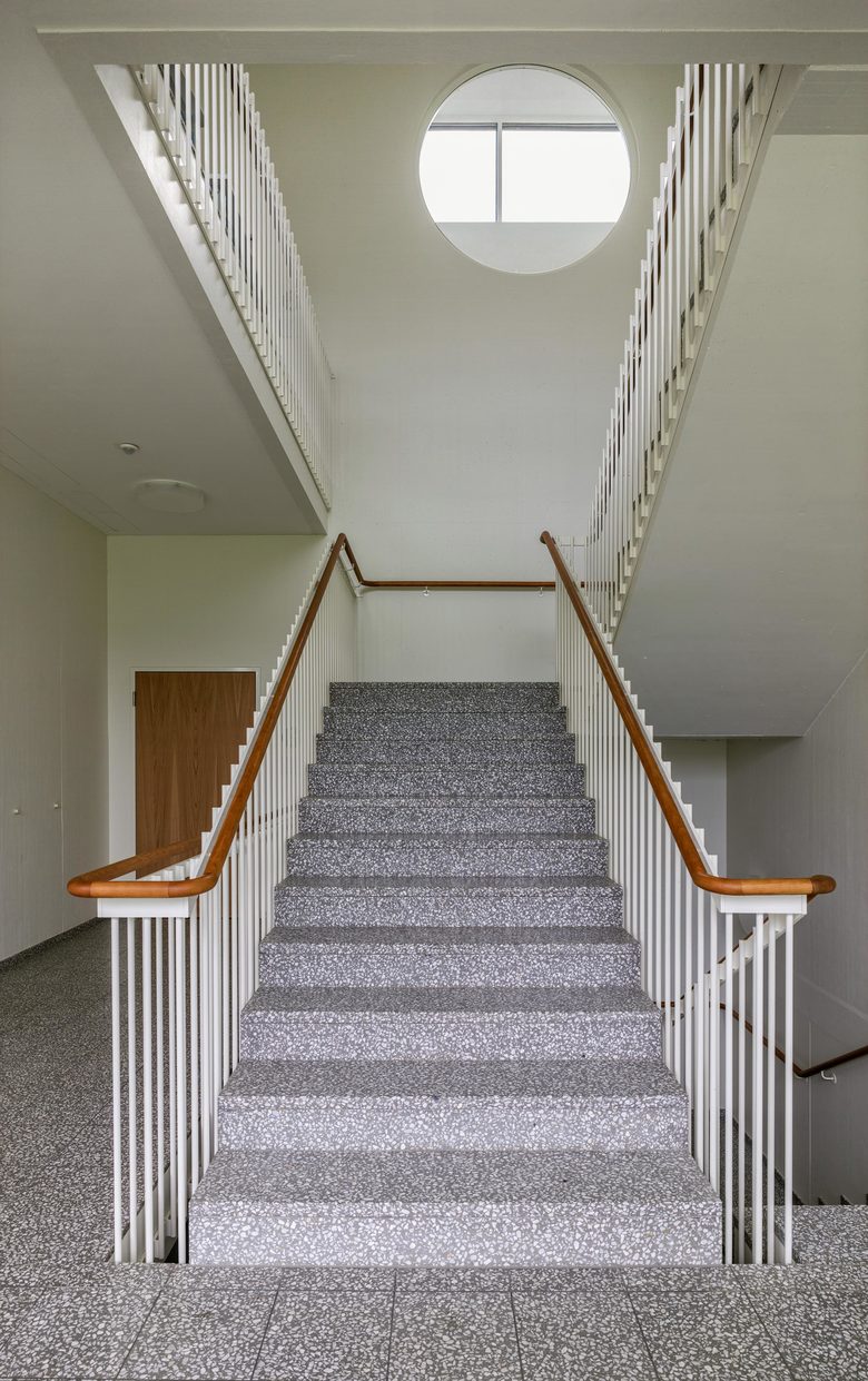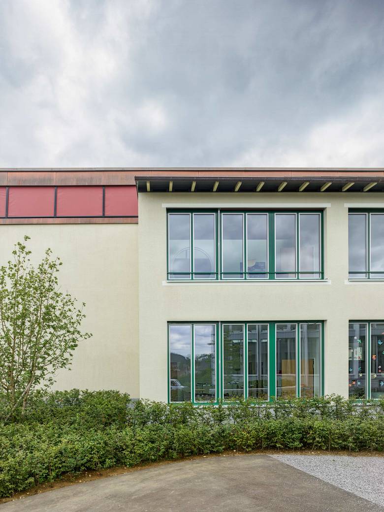 Der Fingerbau ist mineralisch verputzt. Die Textur und Farbigkeit der Putzflächen orientiert sich am Bestand und ist in hellen Grau-, Beige- und Weisstönen gehalten. Dunkelgrüne Holz-Aluminium-Fenster setzen einen Akzent. Das zenitale Tageslicht prägt die hell gestalteten Innenräume.