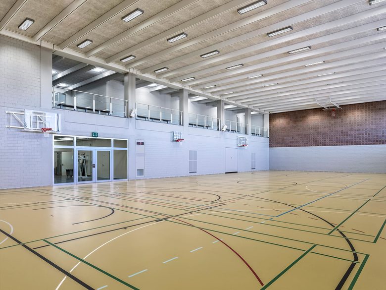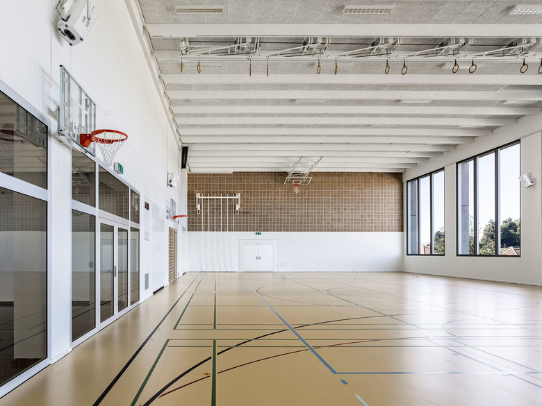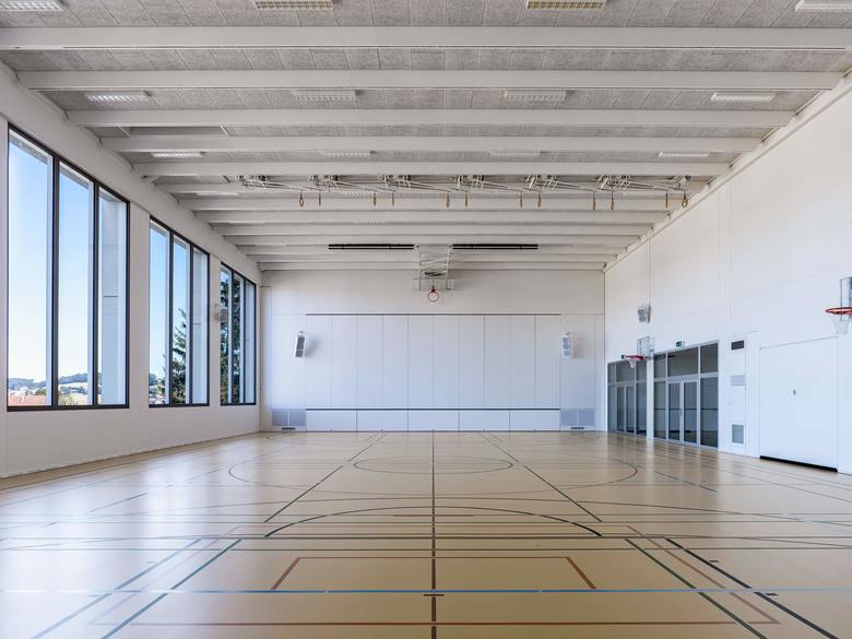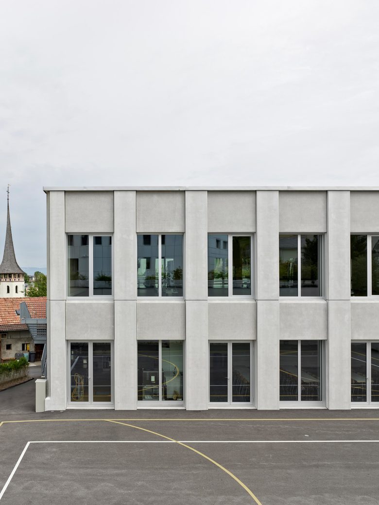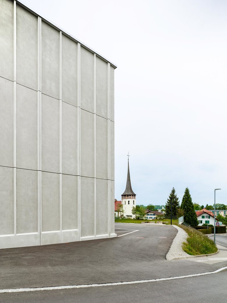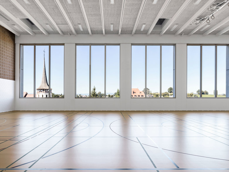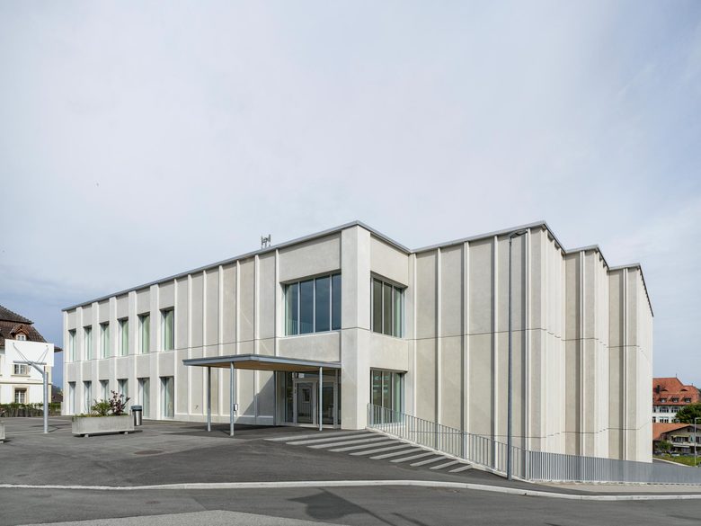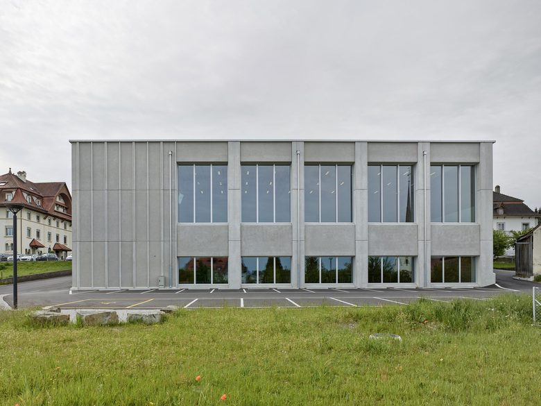 Mit der Verwendung von Weisszement für die Betonelemente erhält der Neubau ein helles Erscheinungsbild und fügt sich trotz seiner prominenten Lage gut ins Dorfbild ein. Die filigranen Lisenen sind einerseits statisch bedingt, bilden jedoch auch das Raster der Tragstruktur nach aussen rhythmisch ab. Die Flächen der Elemente sind sandgestrahlt, um einen feinen Kontrast zur Lisene zu schaffen. Im Innern wird die filigrane Rippendecke freigelegt und mit akustisch wirksamen Zementholzwollplatten ausgefacht. Kombiniert mit den grauen Kunststein- und den ockergelben Sportböden ergibt sich eine ruhige, entspannte Stimmung.