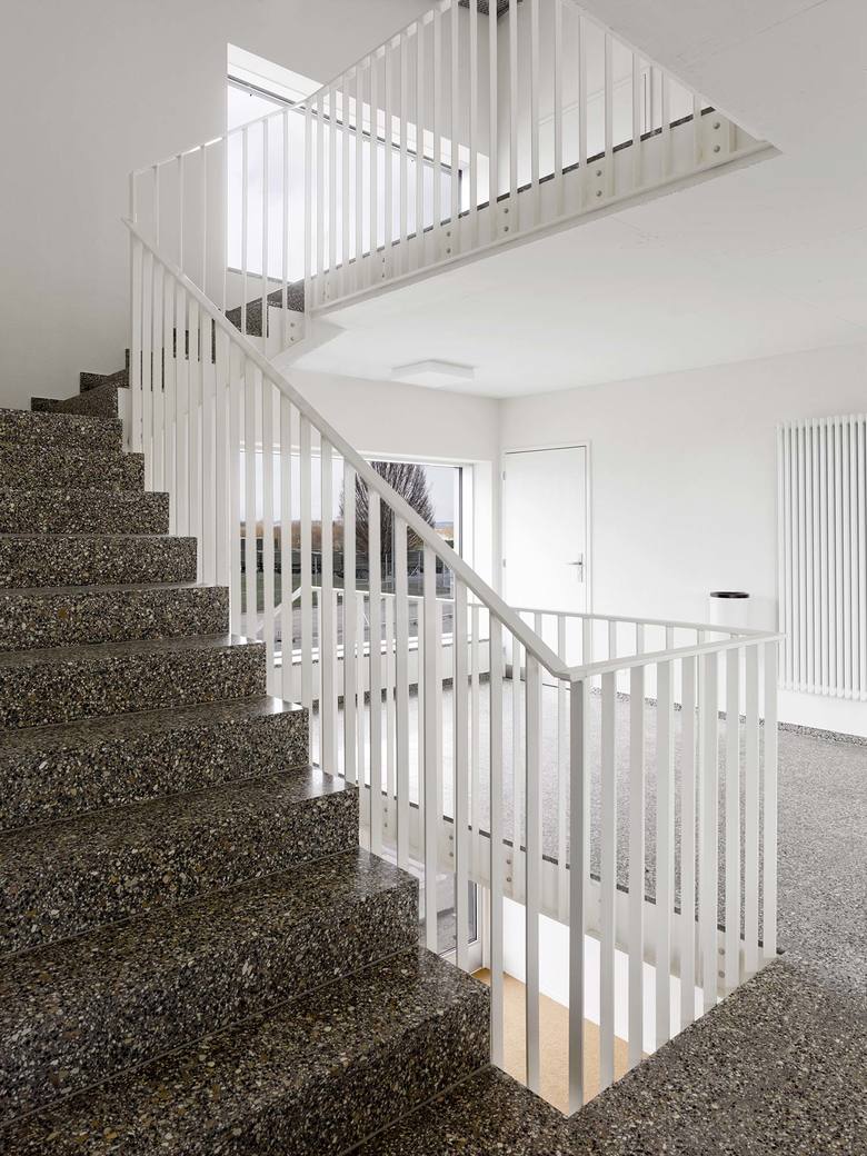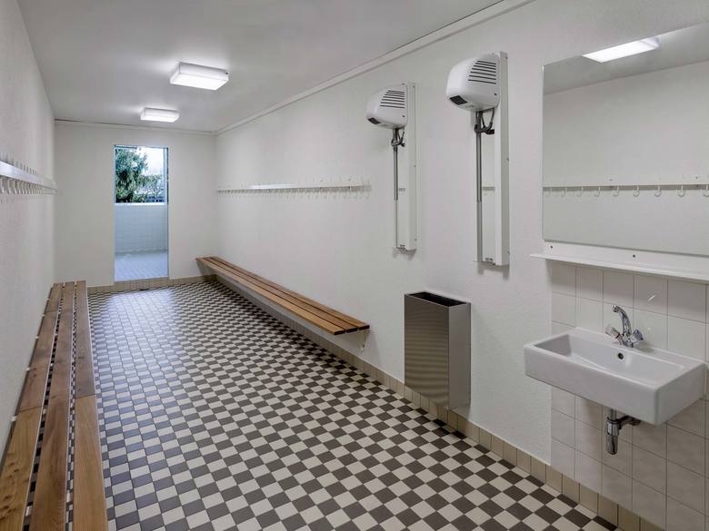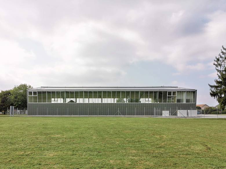 Gedacht als eine dünne papierartige Haut, wurde die Fassade vor Ort vom Spengler von Hand aus Titanzinkblech erstellt. Präzis gefügt und detailliert gestaltet umspannt die neue Stehfalzfassade die bestehende, nach aussen geneigte Stahlkonstruktion. Die Fichten-Dreischichtplatten und der lackierte Stahl kombiniert mit dem dunkelgrauen Sportboden prägen als einfache, robuste und haptische Materialien die Atmosphäre der Halle. Über die vergrösserten längsseitigen Fensterbänder fällt viel Tageslicht in den Raum. Sämtliche Installationen sind in weisser Farbe ausgeführt, präzis gesetzt und sind, wo nötig, neu entwickelt.