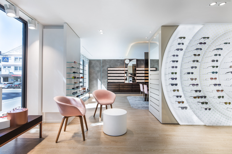 Für die Kundinnen und Kunden erkennbar aufgeteilt, werden die Bereiche durch ein geschmackvolles Farb[leit]system. Der Fachbereich Optik trägt die Farbe Magenta, die Hörakustik die Farbe Türkis – übernommen aus den Farben des Müller-Logos. Türkise und Magenta farbene, eingelassene LED Streifen, lockern die geschwungenen Wände der Untersuchungsbereiche, im hinteren Bereich des Ladenlokals, auf und bieten den Kundinnen und Kunden zugleich eine optimale Orientierung. So beherbergt der linke Teil dieses Flurs, in Magenta, die Optik-Untersuchung (Optometrie) und der rechte Teil, inklusive einer großzügigen Theke, gehört zur Akustik.