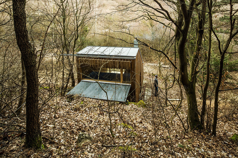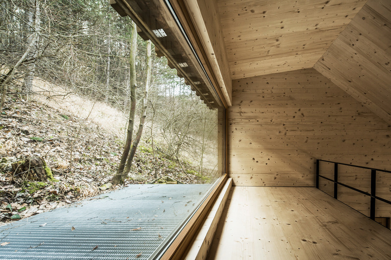Dieses schlichte Haus nimmt starken Bezug auf seine Umgebung, folgt der Kontur eines verfallenden Vorgängerbaus und wurde regelrecht um einen Menschen und seine Leidenschaften herum gezeichnet. Eine kantige Raumform umschließt auf zwei Niveaus das Leben in diesem Rückzugsort. Ganz verschlossen mit allseitigen Läden läßt sich die Hütte zu unterschiedlichen Ausblicken öffnen. Vorgefertigt aus Holz findet sich alles Notwendige auf engstem Raum. Eine markante bauliche Identität wird zum Partner, zum Ort des Rückzugs, aber auch der Gastlichkeit und der persönlichen Weiterentwicklung. Ankommen, Schutz suchen, ausruhen, sich nähren und Gleichklang finden. Dann der Blick hinaus. Vision.
