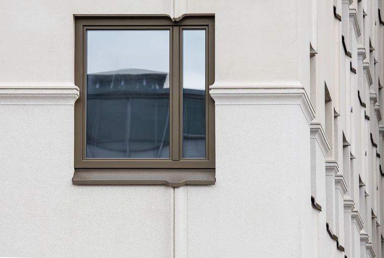 Fensterrahmen und –bleche aus Aluminium kontrastieren in ihrer dunkelbraunen, metallischen Pulverbeschichtung mit der ansonsten hellen Fassade und akzentuieren so zusätzlich den Rhythmus ihrer Gliederung. Die in Farbgebung und Materialität entsprechend gestaltete Fensterfront der Hotellobby im Erdgeschoss und der Haupteingang wurden in Anlehnung an die zuvor hier existierende Arkade deutlich zurückgesetzt. Noch außerhalb des eigentlichen Eingangsbereiches entsteht so ein geschützter Raum.