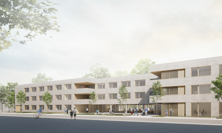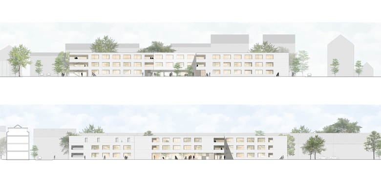 Drei kompakte 3-geschossige Baukörper bilden einen Quartiersplatz an der Smiterlowstraße. Es entsteht ein attraktiver Treffpunkt für die Bewohner und Nutzer der Pflegeeinrichtung sowie für die Anwohner und Besucher des Bürgerzentrums. Der öffentliche Platz bündelt die Eingänge zu den unterschiedlichen Einrichtungen, ambulante und stationäre Pflege, barrierefreies Wohnen sowie das Bürgerzentrum. Großzügige, gut nutzbare Gärten im geschützten Blockinnenbereich bieten Erlebnis- und Erholungsräume für die vielfältigen Nutzergruppen des Pflege- und Bürgerzentrums. Das Foyer mit öffentlichem Café wirkt wie eine Brücke im Erdgeschoss und ermöglicht Blickbeziehungen zwischen der Smiterlowstraße und dem Garten.