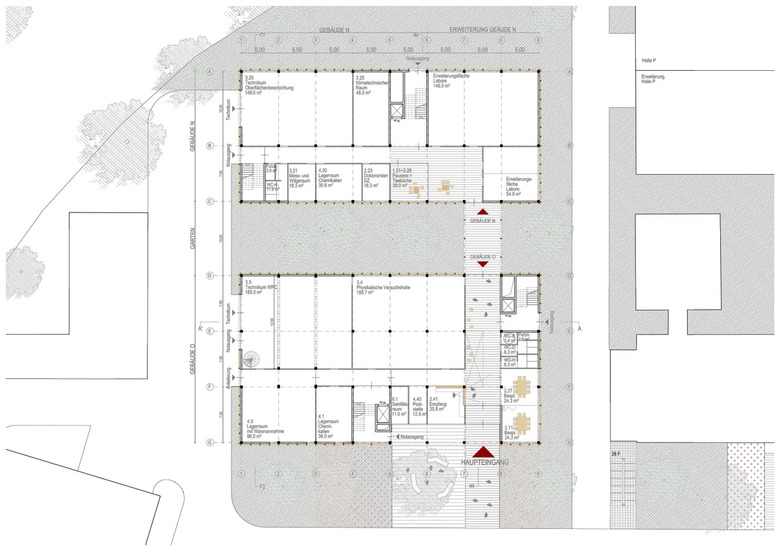 Die baulichen Maßnahmen im Stammgelände, insbesondere der Neubau des Labor- und Bürogebäudes (Gebäude O) stärken das Forum, die grünen Mitte des Campus des WKI und definieren klar die Ränder zu diesem zentralen, repräsentativen Freiraum. Er hat eine hohe Aufenthaltsqualität für die Mitarbeiter und Besucher des Instituts. Die Setzung maßstäblicher Einzelbaukörper führt zu einer harmonischen Weiterentwicklung und Verdichtung des Campus. Der Neubau des Labor- und Bürogebäudes (Gebäude O) und die Erweiterung um das Bauteil N sind als einzelne Bausteine ablesbar. Großzügige störungsfreie Freiräume bieten Erholungsflächen für die Forscher und schöne Ausblicke aus den Labor- und Büroräumen.
