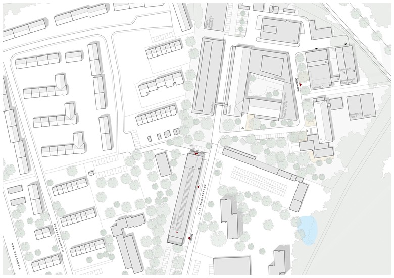 Die Anordnung des skulpturalen Holzbaus schafft eine neue Eingangssituation zum Campus am Bienroder Weg, ohne dabei selbst zum Hauptgebäude zu werden. Die Technikumshalle B ist über seine Materialität aus Holz als dienender Baukörper erkennbar und verweist auf das Stammgelände. Der Eingang zur Technikumshalle orientiert sich eindeutig zum Campus. Ein kleiner Vorplatz bindet das neue Technikum an den Campus an und schafft eine angemessene Eingangssituation zum Neubau.