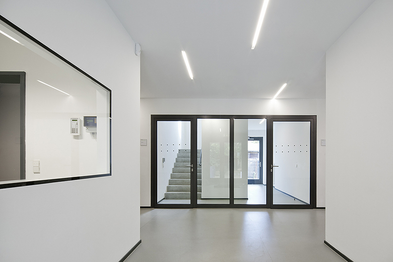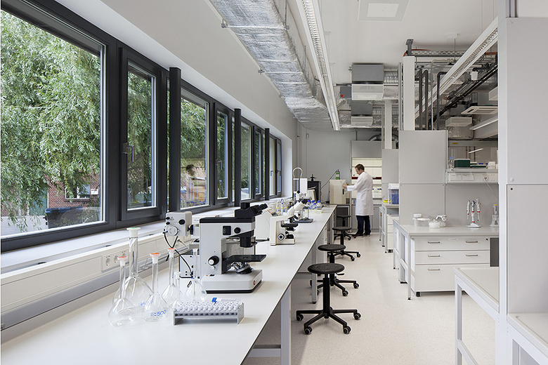 Das Erdgeschoss ist in einen öffentlich zugänglichen Bereich zur Straße hin und einen rückwärtigen Laborbereich, z.T. mit S 2 Anforderungen gegliedert, Sekretariat und Schreibraum am Eingang bieten eine Kontrollmöglichkeit für den Zugang. Das als Großraum konzipierte Hauptlabor für Molekular- und Mikrobiologie wird durch angedockte dienende Räume optimal ergänzt, in angrenzenden Räumen sind Labore für Immunologie und Isotopentechnik untergebracht. Die Maßnahme wurde durch Mittel aus dem Konjunkturpaket II gefördert.