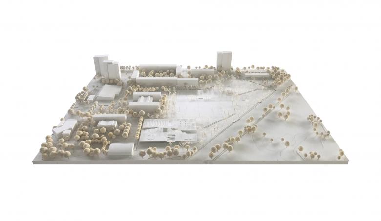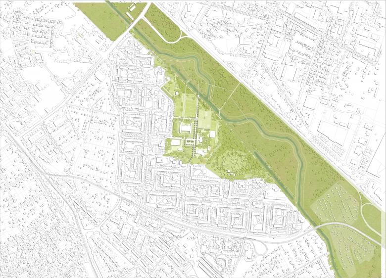 Das bespielbare grüne Dach fördert die Integration der großen Baumasse in den zentralen Park der großen Wohnsiedlung, die Bürger erhalten die überbaute Fläche als intensiv nutzbare Parkfläche zusätzlich zur Verfügung gestellt. Der Dachgarten gewinnt durch die weiten Blicke über das Nuthetal zusätzlich an Qualität. Das Gebäude leistet damit einen wichtigen Beitrag zur Verbesserung der Identifikation aller Nutzer mit der Siedlung. In der vorgeschlagenen Verlängerung des Nuthewegs, gelingt mit einem Brückenschlag über die Nuthe sogar die Anbindung an den Ortsteil Babelsberg.