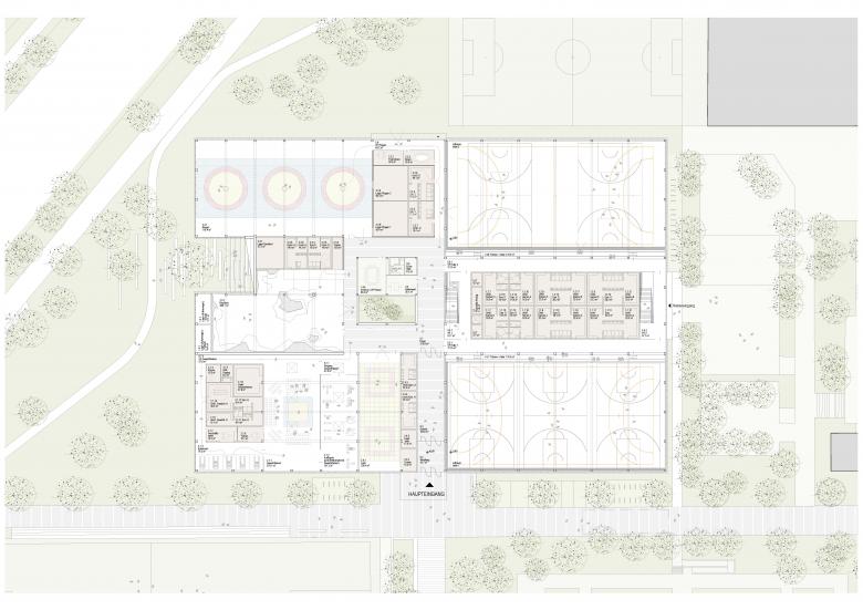 Die Sportflächen der beiden Doppelsporthallen liegen unterhalb der Eingangsebene und sind über eine großzügige Treppe und barrierefrei über einen Aufzug an diese angebunden. Viel natürliches Licht dringt über die seitlichen großzügigen Verglasungen in die Sportbereiche ein. Das schafft eine lichte und freundliche Atmosphäre im neuen Sportforum. Ein zweiter, zu den beiden öffentlichen Schulen gewandter Eingang, ermöglicht es den Schülern unmittelbar vom geschützten Schulgelände aus, den Bereich der Zweifachhallen zu betreten. Die Umkleiden sowie die Tribünen befinden auf der Eingangsebene des neuen Sportforums und die Lagerflächen für die vielfältigen Sportarten in der Hallenebene.