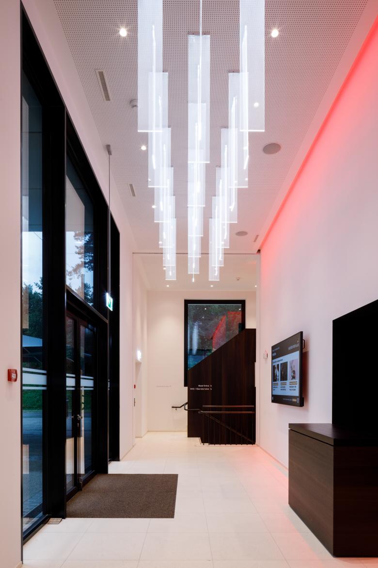 Der Veranstaltungssaal ist der Raum, in dem die Hauptaktivitäten stattfinden. Es handelt sich um einen zweistöckigen, geschlossenen Raum ohne Tageslicht-Öffnungen mit weißen Wänden, dunkler Decke und Holzfußboden. Ziel der Beleuchtung ist es, den Raum visuell zu erweitern und über die Bespielung der weissen Wände verschiedene Lichtstimmungen zu erzeugen. Die RGBW-Wandfluter sind umlaufend auf beiden Ebenen des Saals angeordnet. Der Lichtkegel dieser Lichtlinien ist sehr schmal, so dass das Licht nicht auf das Publikum fällt. Die Grundbeleuchtung erfolgt über Deckenfluter, die ebenfalls als RGBW-Farbwechsler für eine hohe Flexibilität in der Lichtstimmung sorgen. Die gesamte Innenbeleuchtung ist farbveränderlich (RGBW-Licht) und es gibt definierte Lichtszenen, die vom Nutzer ausgewählt und überschrieben werden können. Die Steuerung erfolgt über einen Touchscreen für die Alltagsnutzung oder ein umfangreiches Lichtmischpult, für die Lichtsteuerung bei Anlässen. Unter der Empore sorgen Einbaustrahler für die Grundbeleuchtung vor der Cateringzone.