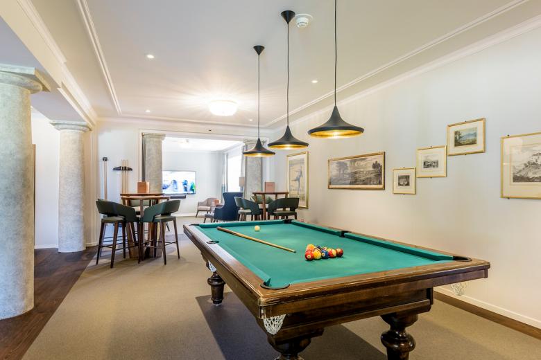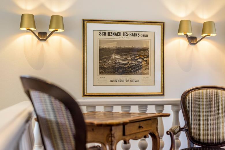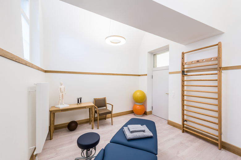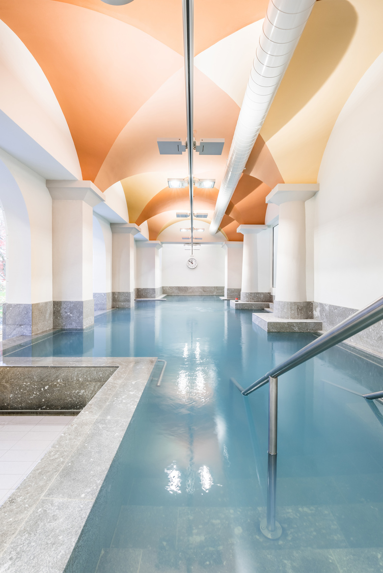 Das 4* Kurhotel und die Privat-Klinik im Park befinden sich in einem schlichten klassizistischen Gebäude in Schinznach-Bad. Die Therapieräume im denkmalgeschützten Rundbau erreicht man durch einen Gang mit ästhetischer Gewölbedecke. Diese Schönheit hervorzuheben war neben den funktionalen Anforderungen in der zweiten Phase die grösste Herausforderung. Neuland für uns war einen abstrahierter Wandtäfer aus Glasfaserbeton zu entwerfen, der auch härteste Rollstuhlattacken spurlos aushält. Die farbenfrohe Decke im Schwimmbad generiert das Erscheinungsbild eines Hotels statt einer Klinik.