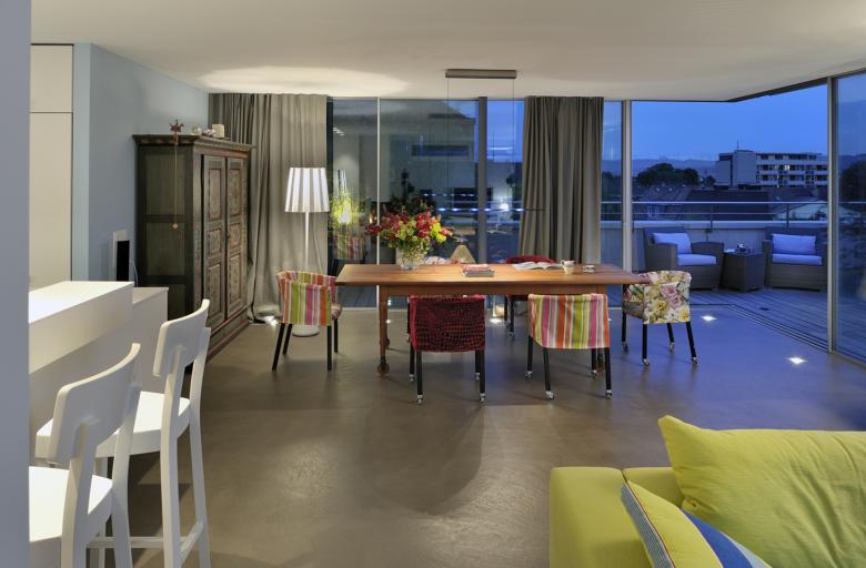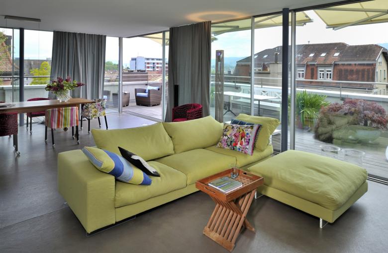 Viel Farbe, eine stilvolle Kombination von antiken Möbeln und modernem Design sowie ein grosser Aussenraum machen die Attikawohnung im Kreiss ll in Zürich zu einer Oase.