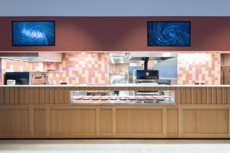 Die rundum verglaste Mythen-Lounge zeigt eine grossformatige Neonlicht-Installation, die sich auf die Stoos-Fabel der sprechenden Katze bezieht.