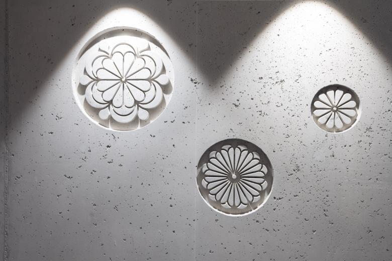 So haben wir historischen Silberschmuck der Innerschweiz, massstäblich vergrössert und abstrahiert, in die Betonwände der Korridore des gesamten Gebäudes reliefartig eingegossen.