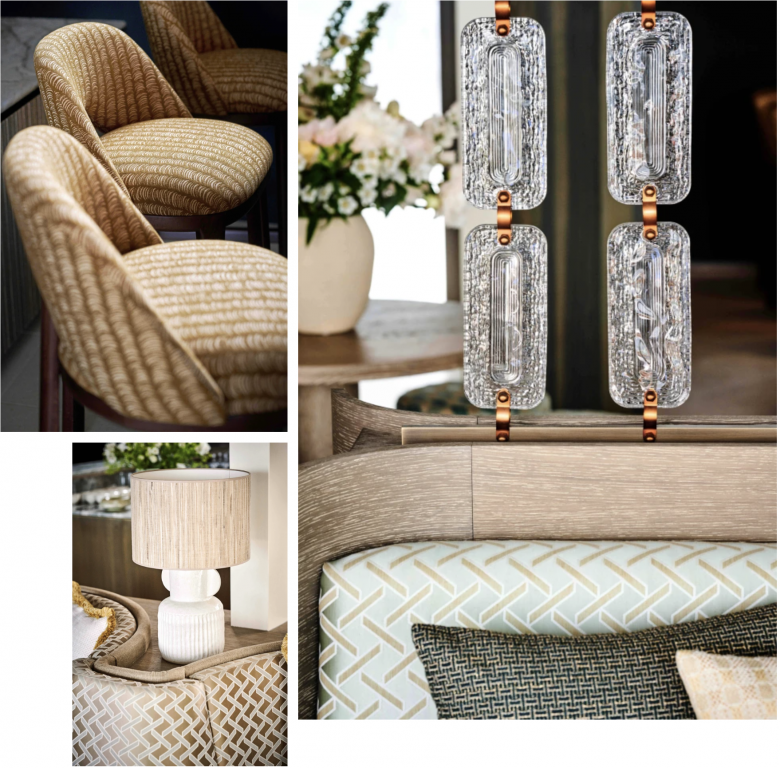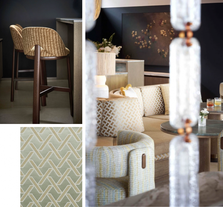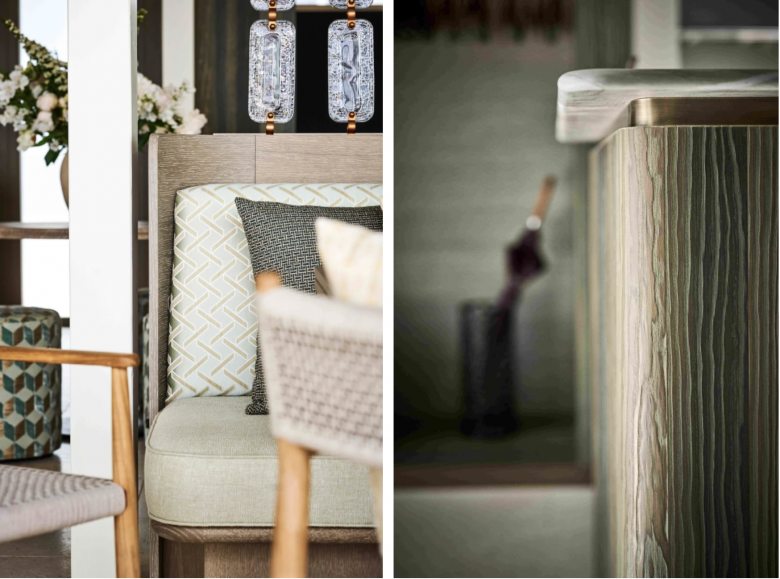 Pale limestone floors evoke sun-drenched Mediterranean terraces. Emerald Jadore quartzite dining tables reflect the shimmering surface of water. Upholstered benches in patterned Dedar fabric recall the relaxed elegance of mid-century beach clubs, reimagined with a modern, understated touch.