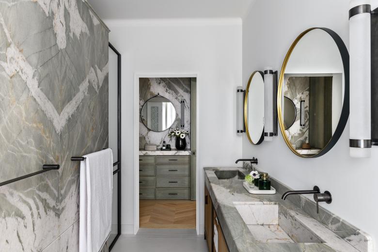 The bathrooms feature a beautiful green Verde Antiqua stone used to create accent walls, as well as the carved stone tops on custom designed vanities. Light fixtures by Marc Woods give the room a pop of elegance.