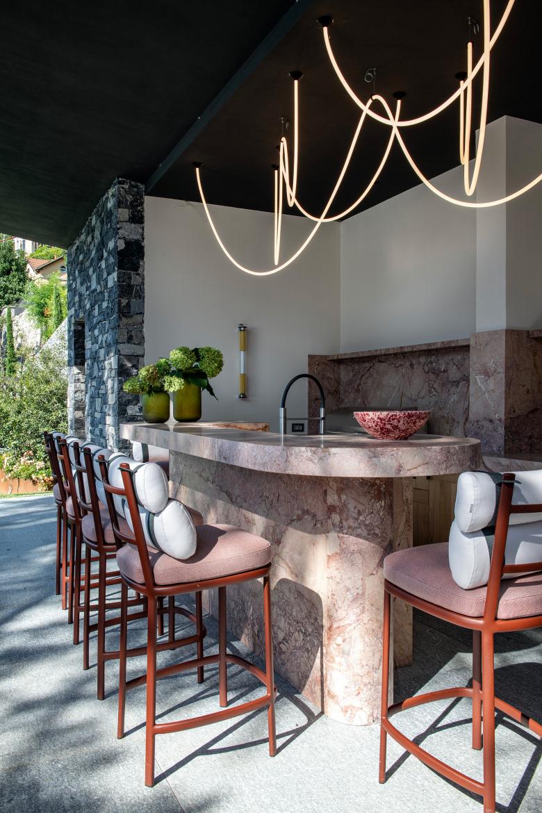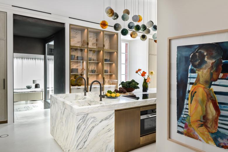 New terrazzo floors were created on the Ground Floor outside of the three primary rooms. We chose a simple off-white color to give a contemporary, yet classic feel, but have a more traditional mosaic border to tie them back to the original floors. There is a playful arrangement of new mosaic flowers that are sprinkled around these rooms, and once again refer to the history of the place, but in a completely modern and unexpected way.We found an incredible stone, Calacatta Arni, with undulating patterns of green and beige veins within a white field, to pair on the island with bronze cabinet doors. This jewel box is truly the heart of the Kitchen, where the entire family can gather around.