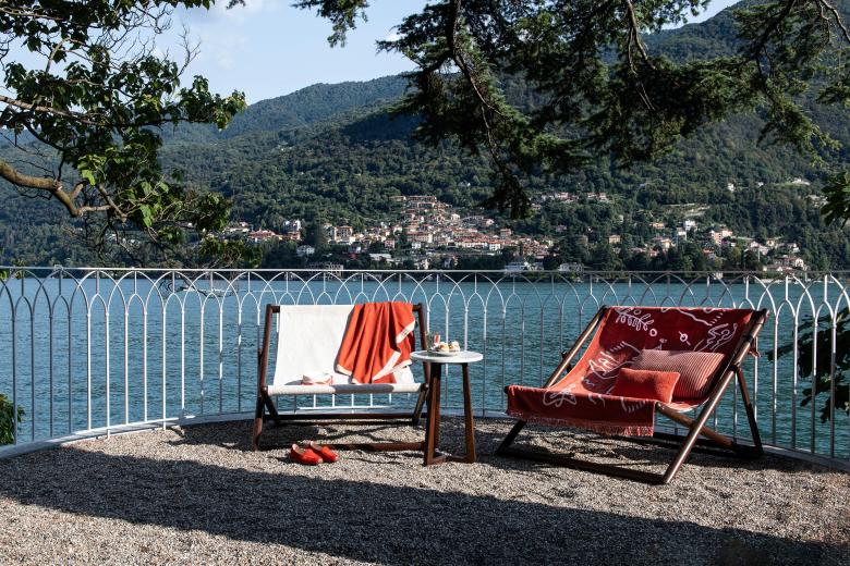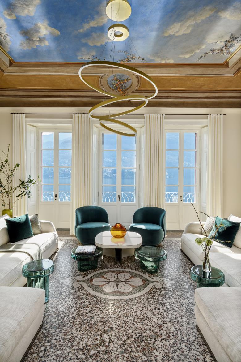All of the bedrooms have sweeping views out over the gardens and Lake Como, and beg one to sit and linger. Custom linens were designed with a logo created using the same flower motif used in the new terrazzo floors, based upon one of the original mosaic rosettes.