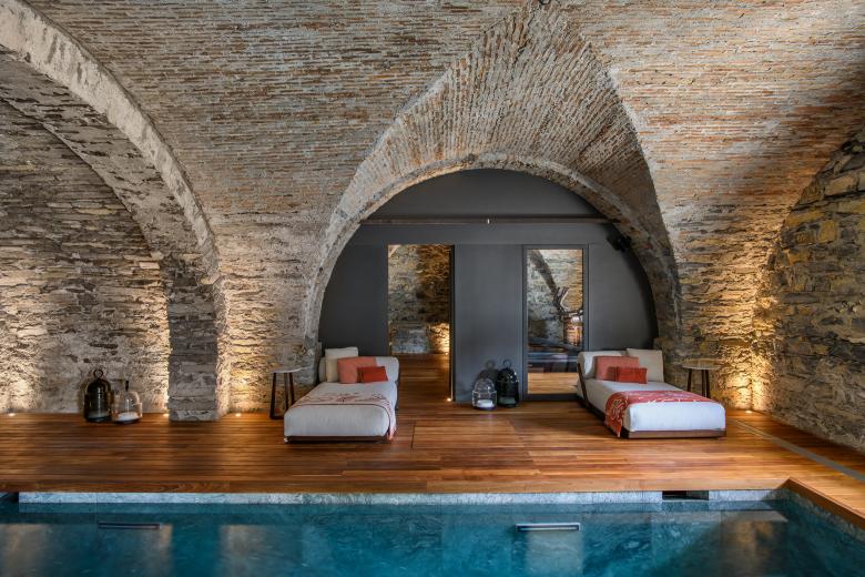 The Basement Floor might hold the biggest surprise for the coming visitor. Originally, the open space under the house was the docking location for the owners’ boats. One bay was left open for a boat, while the other two bays have been enclosed and made watertight to create an indoor swimming pool, fitness and spa area. The marvelous existing stone and brick vaulting becomes the backdrop for a new sanctuary where the owner can relax and rejuvenate