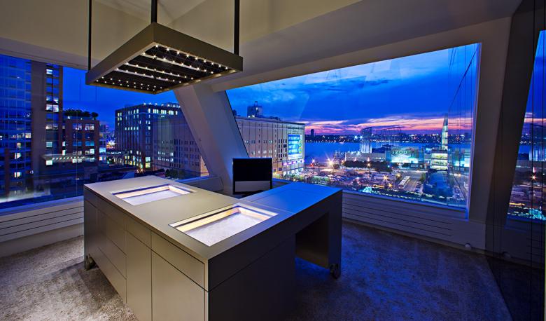 Material und Farbauswahl vermitteln sowohl Wertigkeit als auch legere Urbanität. Jeder Raum lebt vom direkten visuellen Bezug zur faszinierenden Stadtlandschaft von New York City.