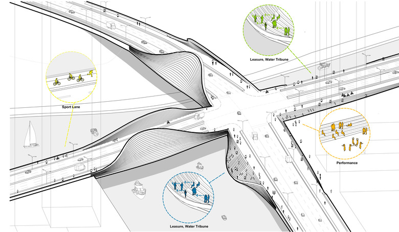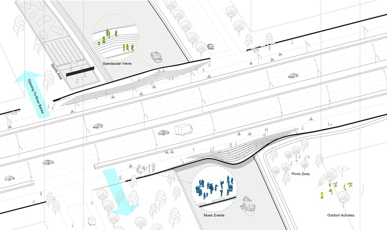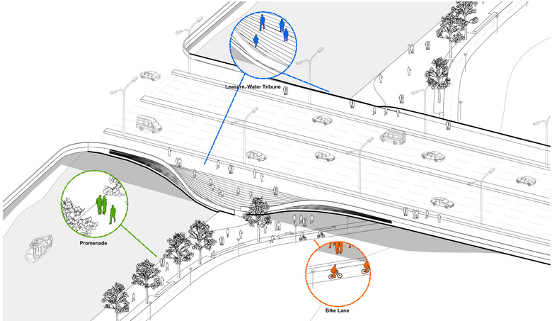 The Bridges Nr. 4 and Nr.5 create an interesting crossing point,marking the start of the entire Waterpark.Because of the practical reasons and their proximity, we have created a unique structure marking the “The East End” point and the corner point of the river canal.Both bridges are well thought out andmatch their usage requirements as well. The areas underneath of the bridges will become a meeting point for pedestrians, attracting people to enjoy the water,take a rest, and refresh themselves in the summer.