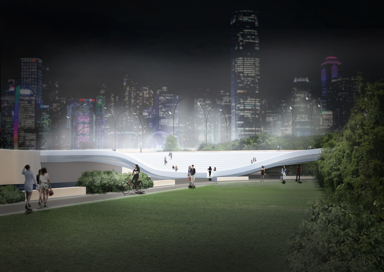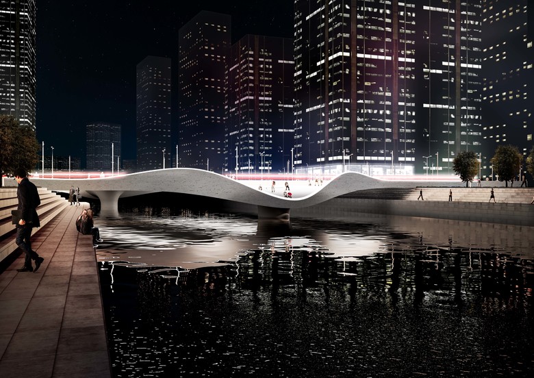 The Bridge Nr.1 has a very special position and it will be an integral part of Hangzhou‘s new silhouette. It is the entrance by water to the entire site, and must be treated in anexceptional way. The appearance of this bridge shouldbe given a great importance. We anticipate that people will regard it as a landmark for their orientation and it must be visible from the distance. It plays an important role in the traffic system of the Riverbank for both vehicles and public transportation on one hand, and pedestrians who will be crossing the water channel very frequently on the other hand. In addition to itssymbolic role like a gate, it possesses an elegant and recognizable silhouette that could be likened tothe number “8”,the Moebius band, or even the symbol for infinity (longevity).At the same time, it is visually not competing with the iconic buildings behind it.