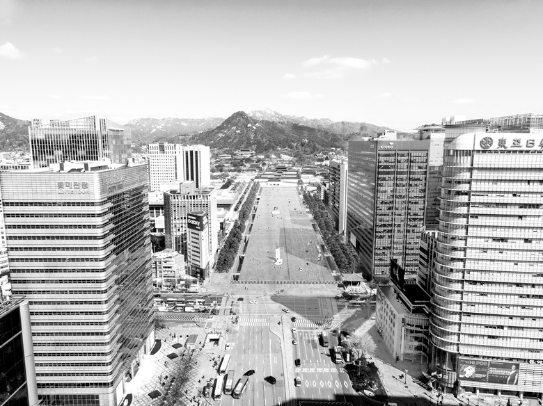 A street in Seoul from the standpoint of cultural geography and activities taking place in the street, are direct expressions of the Korean milieu. In every city there is a natural hierarchy of streets, which constitute the local transportation network and resemble arteries in a body. In Seoul, due to the peculiarities of its location and history, these organic networks did not have a chance to develop. Instead, very different levels of hierarchy came into play, forming truly “hybrid” spaces. The “hybrid spaces” are the result of a transformation of vernacular forms through the introduction of new elements and technical innovations. The Gwanghwamun Square is a good example of such a hybrid space.