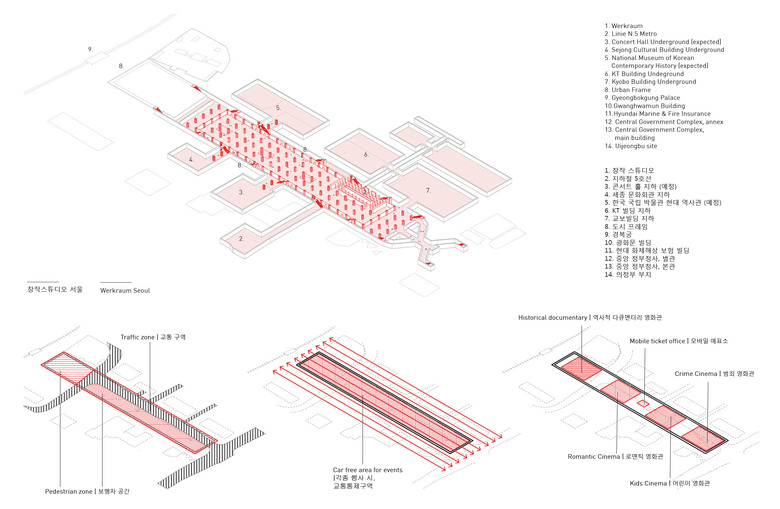 The Architecture is a spiritual order embodied by buildings. What is going to remain of us for the next generations? Only the Korean culture will remain. Gradually, as a medium to long term objective, all the buildings surrounding the Gwanghwamun Sqaure should be replaced by cultural facilities in order to create and support the “Cultural Axis” along the North-South direction.This historic path has a symbolic value linking Mt. Bugaksan in the north and Mt. Namsan in the south. The new quality should be urban porosity enabling access for pedestrians along the entire connection between the two mountains. A physical link through the existing urban tissue should facilitate wider passage through urban structures including the palace and side streets along the entire north-south direction.