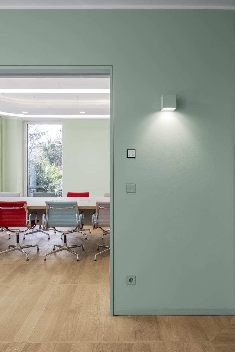 Wandfarben aus der Farbklaviatur Les Couleurs® Le Corbusier® verleihen den Räumen Frische und Heiterkeit. Im großen Besprechungsraum in der Farbe vert anglais pâle (32042) passen sich Konferenztisch und Deckenleuchte im Radius an das halbrunde Erkerfenster an.