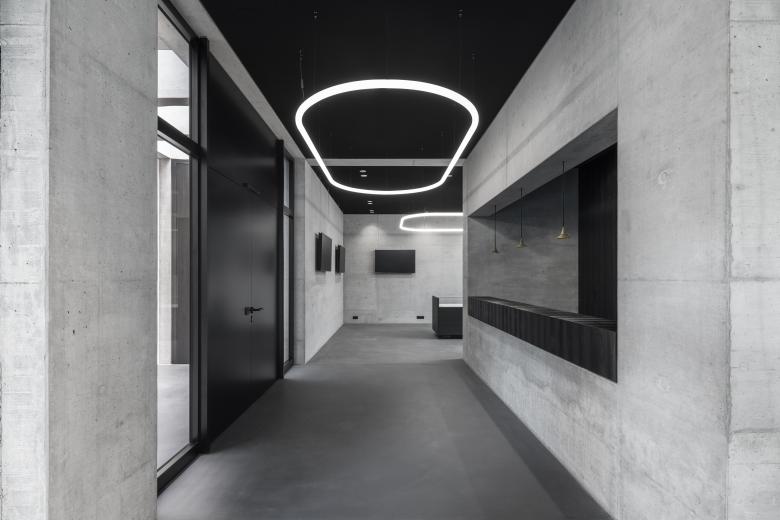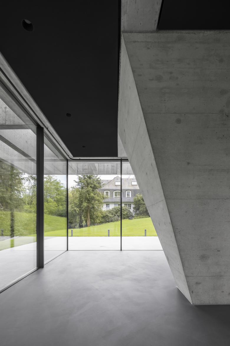 Im tiefergelegten Neubau münden Eingang, Garderobe und Firmengalerie in den multifunktionalen Hauptraum mit prägnanter Stütze, der sich ebenerdig zum Gartenniveau öffnet.