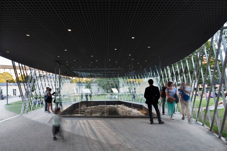 ADDED VALUE: In bewusster Abgrenzung von den im städtischen Kontext üblichen gläsernen Vitrinen umhüllt eine offene Edelstahlkonstruktion den notwendigen klimatischen Raumabschluss. Es entsteht eine spannungsreiche Zwischenzone, die offen zur umgebenden Gartenanlage zum Verweilen und zur Auseinandersetzung mit der Stadtgeschichte einlädt.