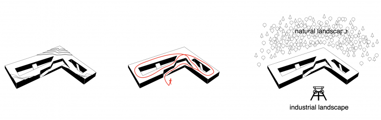 Die gewinkelte Gebäudeform nimmt die Grenzen des Eckgrundstücks auf und bildet eine Adresse zum vorgelagerten ‚Weißen Platz‘. Von hier aus setzt eine großzügige Treppenanlage die umgebende Landschaft fort und führt hinauf auf den Dachgarten. Dieser bietet Mitarbeitern mit Spazierpfad, kleineren Platzsituationen, verschiedenen Sitzgelegenheiten und diverser Bepflanzung ein abwechslungsreiches Angebot an der frischen Luft samt Blick auf Natur und Zechengelände. Die Büroräume der beiden Nutzer sind um zwei ebenfalls begrünte Innenhöfe angeordnet und werden ringförmig erschlossen. Die Räumlichkeiten der RAG-Stiftung und der RAG AG befinden sich im nördlichen und östlichen Flügel, während die gemeinsam genutzten Bereiche wie Mitarbeiterrestaurant, Konferenzbereiche und Haustechnikzentrale mittig im Gebäudegelenk untergebracht sind. Der Neubau orientiert sich an innovativen Nachhaltigkeitsstandards nach der „Cradle to Cradle“-Denkschule und erhielt außerdem die DGNB-Zertifizierung in Platin.
