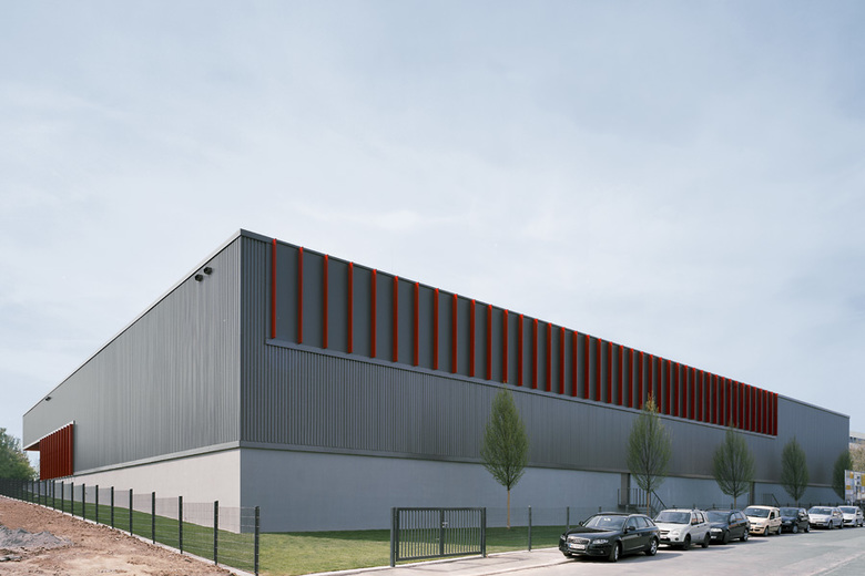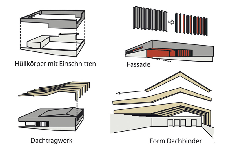 Die Halle ist als kompakter Baukörper mit gestaltprägenden Fassadeneinschnitten und -modulationen entworfen. Das große Bauvolumen wird in der Höhe in Sockel und Dach untergliedert. Der Sockel aus Betonfertigteilen dient als Fundament und Anprallschutz und ist nach außen hin glatt verputzt. Das Dach aus einer Holzleimbinder-Konstruktion spannt den Hallenraum über 30m auf und erhält eine Dachhaut und Fassade aus Trapezblech.Die grafitgraue Trapezblechfassade löst sich im Bereich der Einschnitte in vertikale Blechlammellen auf. Diese bespielen in ihrem auffälligen rot jede der vier Fassadenseiten, als Fenstergliederung, Vordachuntersicht oder einfach als Hingucker!
