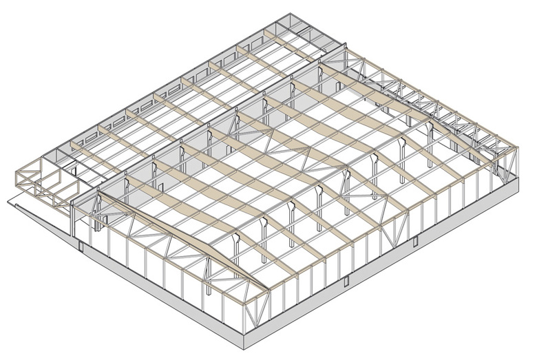 Im zentralen Hallenraum erhält das Betriebsgebäude durch die Form der Dreifeld-Dachbinder ein räumliches Dachtragwerk und gibt ihm und dem Dachdeckerunternehmen einen identifikationsstiftenden und lichten Innenraum.