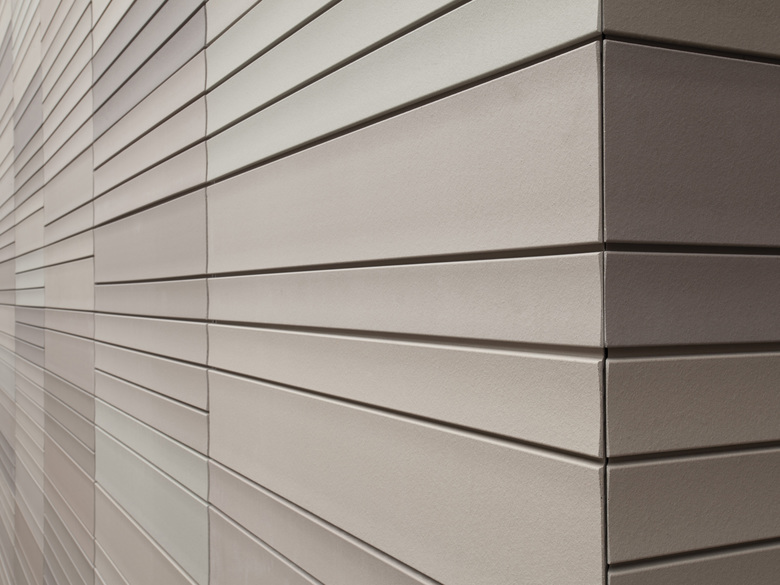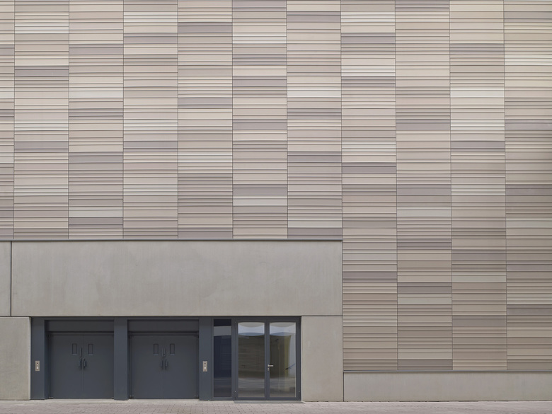 Die stadträumlich eingebaute Südseite ist auf Nahsicht angelegt. An ihr entlang verläuft eine fußläufige messeinterne Erschließungsachse. Naturgebrannte Keramikelemente in verschiedenen Farbschattierungen nehmen die Materialität und Farbigkeit der Umgebung auf und schaffen einen freundlichen und städtischen Raum für die Messebesucher. Das extra entwickelt Keramikprofil mit horizontalen Fugen und einer konkaven Krümmung belebt die flächige Wirkung der 3.500qm großen Keramikfassade.