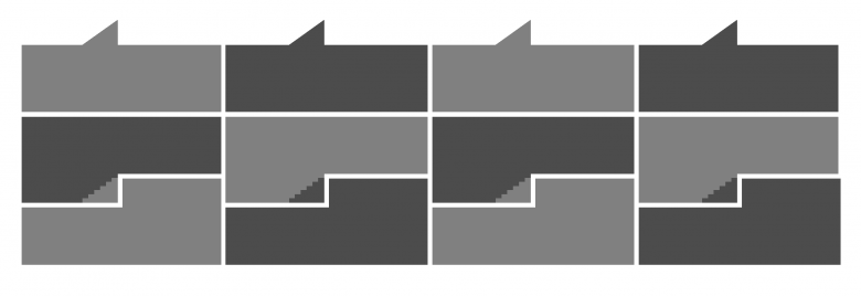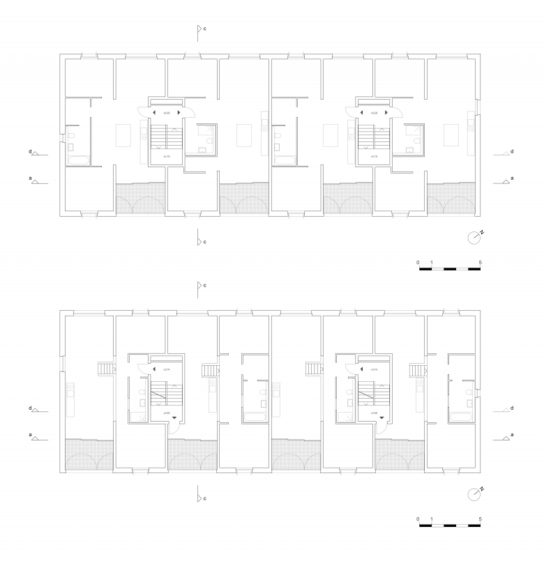 Der Grundriss ist streng in sich abwechselnde, über die gesamte Gebäudetiefe erstreckende Zonen aufgeteilt. Die weniger hohen Schlafräume und Bäder bilden dabei die privatere Zone, während die öffentlichere Zone alle Funktionen um Wohnen, Essen und Kochen beherbergt.