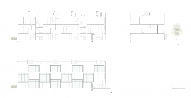 Die verspringende Geschossdecke über dem Erdgeschoss führt zu differenzierten Raumhöhen in den beiden unteren Geschossen. Dieser großzügige Raumeindruck wird durch großflächige Verglasungen beiderseits des durchgesteckten Wohn-/ Koch- und Essbereichs unterstützt, die auch eine natürliche Belichtung der Raumtiefe ermöglichen. Diese Funktion übernehmen in den oberen Wohnungen zusätzlich in Gebäudemitte angeordnete Oberlichter. Auf der Südwestseite verfügen alle Wohnungen über einen Wintergarten, der multifunktional als Loggia und/ oder Wohnraum genutzt werden kann.