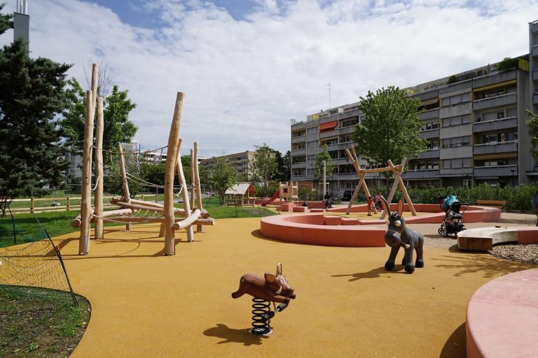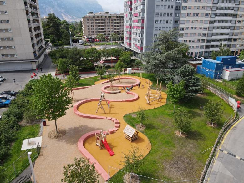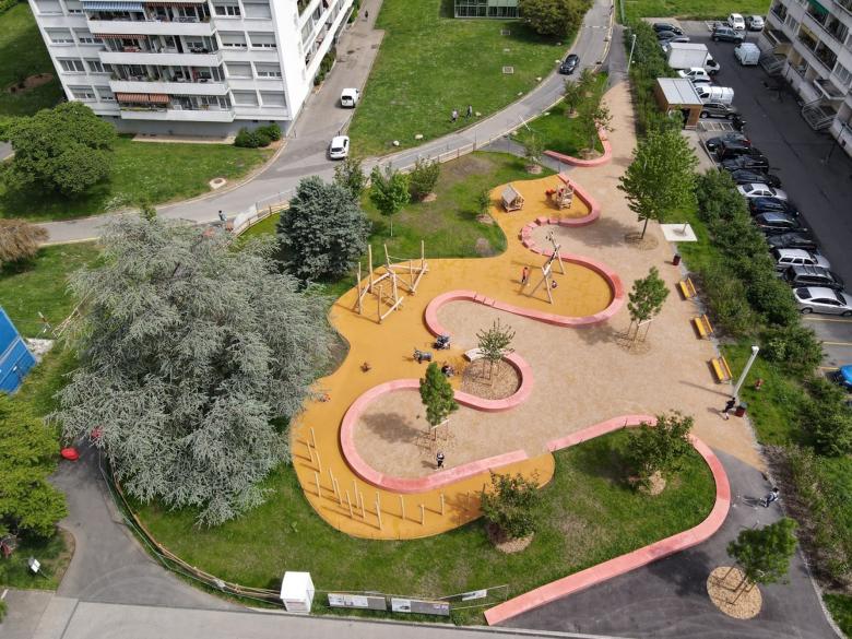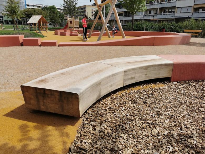 Du côté Est du muret on retrouve des placettes et les connexions au quartier. Des équipements urbains "ici et là" invitent à la rencontre ou juste à s'arrêter un peu.