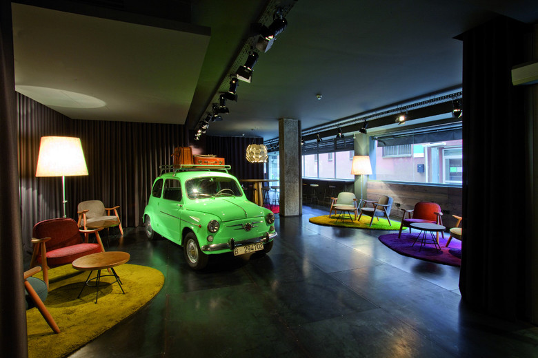 In the lobby we played with iconic objects from those years: a Seat 600 – the first mass produced Spanish car – a huge Peseta – Spanish old currency – used as a table and a panel with very big magnetic key-rings, as used back then in the local hostels...