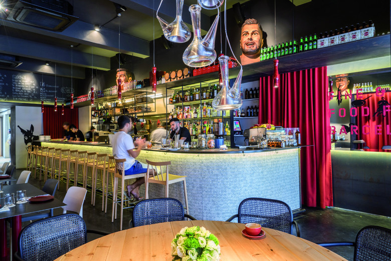 Rafael Marquina’s iconic cruet and the emblematic pepper mills; a series of graffiti such as the Burro’s (the donkey is a Catalan symbol), La Sagrada Familia’s, Messi’s, and Spanish typical tiles. Dominoes covered the bar, a very popular game at Spanish’s bars… (we discovered it is famous worldwide recently), late 60s’ Impala symbolic motorbike… A play to turn popular things into a new approach that will wow you!