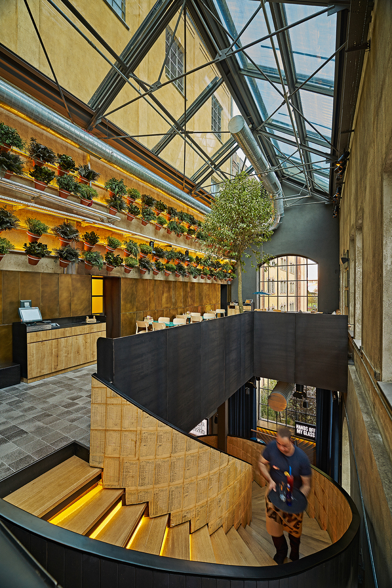The three floors of the late XIX century factory are organised in six areas sharing the same hero: craft beer. To serve the cause each of them has its own personality, working as single spaces within a great unique complex. Right at the entrance 6 enormous high-raised beer tanks exhibited in a 2 ways glass box welcomes the beer drinker. A dj station set in an orange vintage Volkswagen van foresees what we’ll find inside: rehabilitated stainless steel tanks, ‘megaphone’ sculptures, bottle-shaped luminaries or an old dark brick and mortar tank converted into an indoor balcony.
