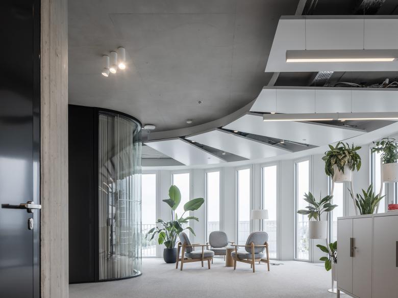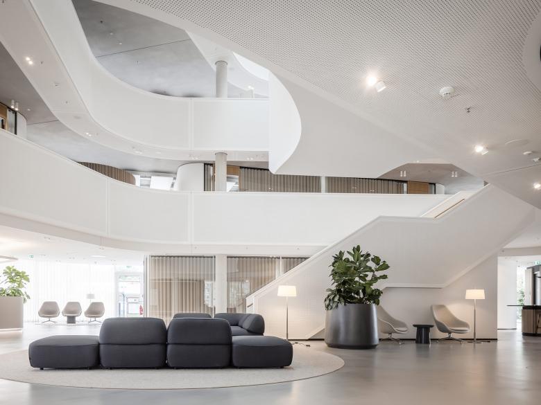 Auf einer Gesamtfläche von 7.200 m² spiegelt das Gebäude die Grundwerte des Unternehmens – Innovation, Offenheit und Nachhaltigkeit – wider. Klare, organische Formen und Tageslicht charakterisieren dabei den Innenraum mit einem zentralen Atrium, das sich über alle Geschosse erstreckt. Basierend auf den New-Work-Prinzipien fördern offene Arbeitsbereiche kreative Zusammenarbeit und den Austausch zwischen den Mitarbeitenden. Individuell gestaltete, geschlossene Bereichen bieten dabei Rückzugsmöglichkeiten und Raum für ungestörtes Arbeiten.
