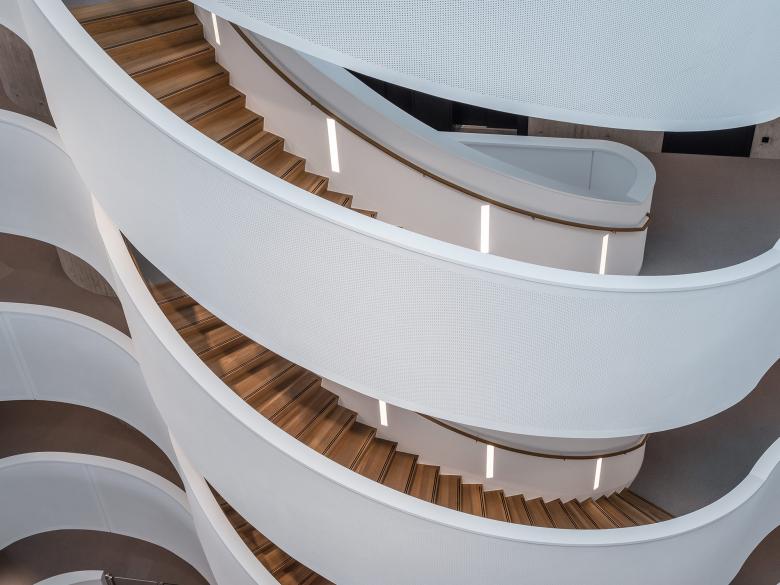 Die geschwungene, organische Treppe mit strahlend weißen Brüstungen prägt das Bild des Atriums.