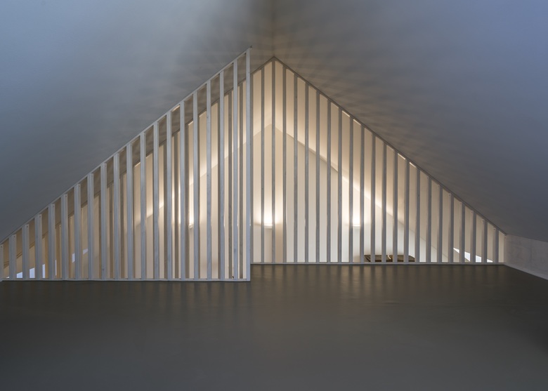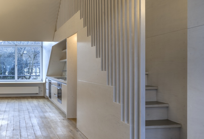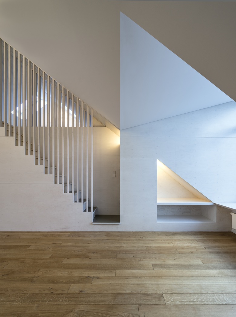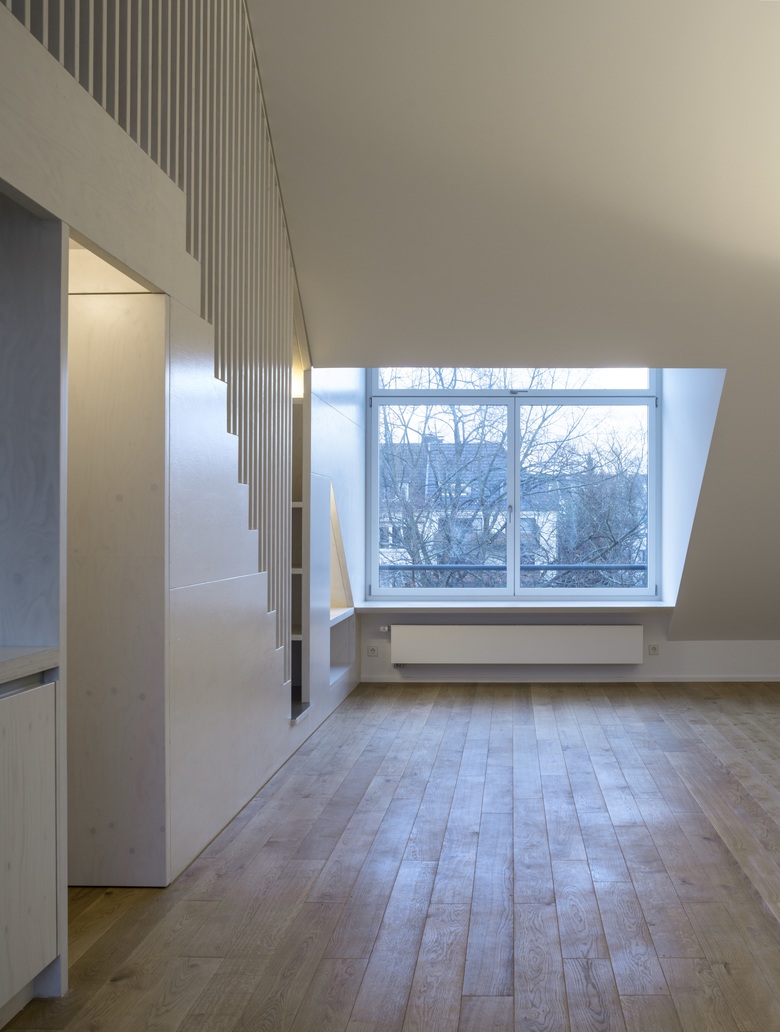 Die weiss lasierten Holztafeln fungieren darüber hinaus als Raumteiler zwischen den dienenden, gestapelten niedrigen Räumen auf der einen Hälfte des Dachgeschosses und dem hohen, der Dachform folgenden, die großen Gauben auf Strassen- und Gartenseite verbindenden Hauptraum auf der anderen.