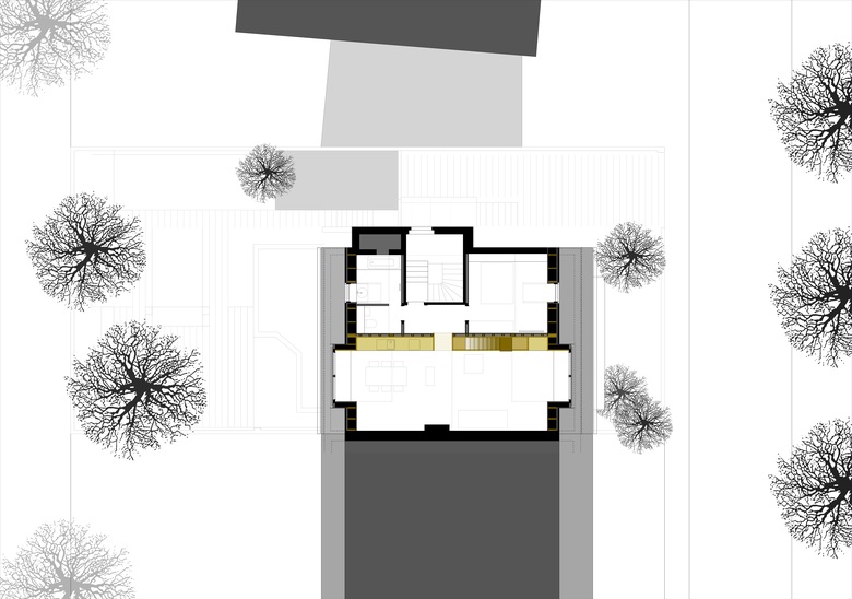 Statt drei kleiner Gauben wird strassen- und gartenseitig jeweils eine überhöhte Gaube mit Gegengefälle zum Dach ausgebildet.